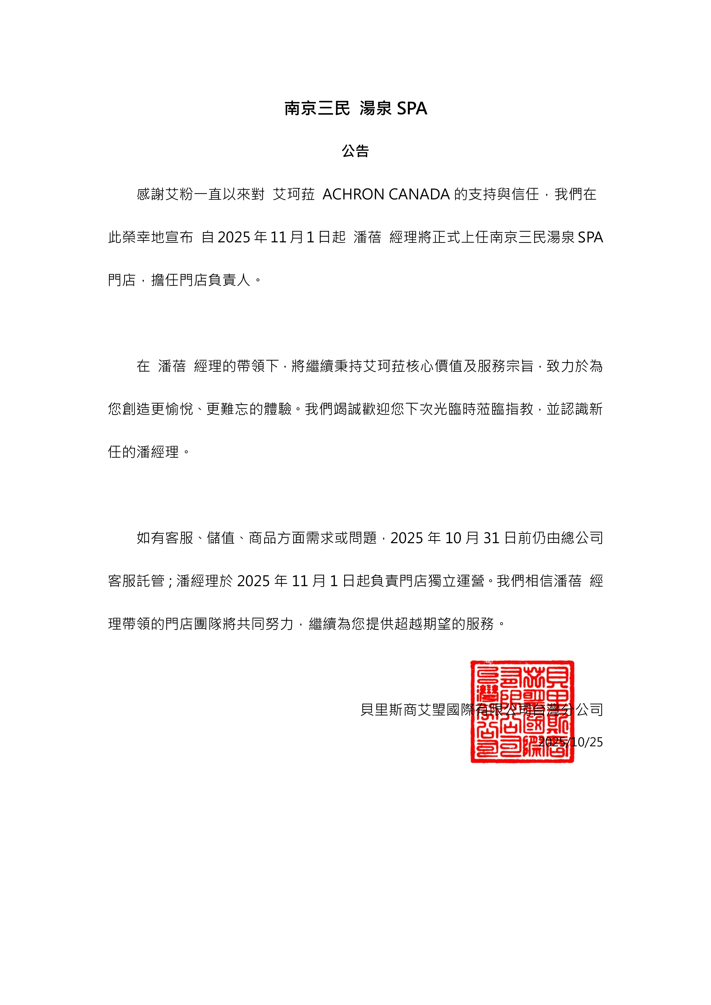 A'CHRON 艾珂菈:南京三民湯泉SPA公告 新經理帶領團隊