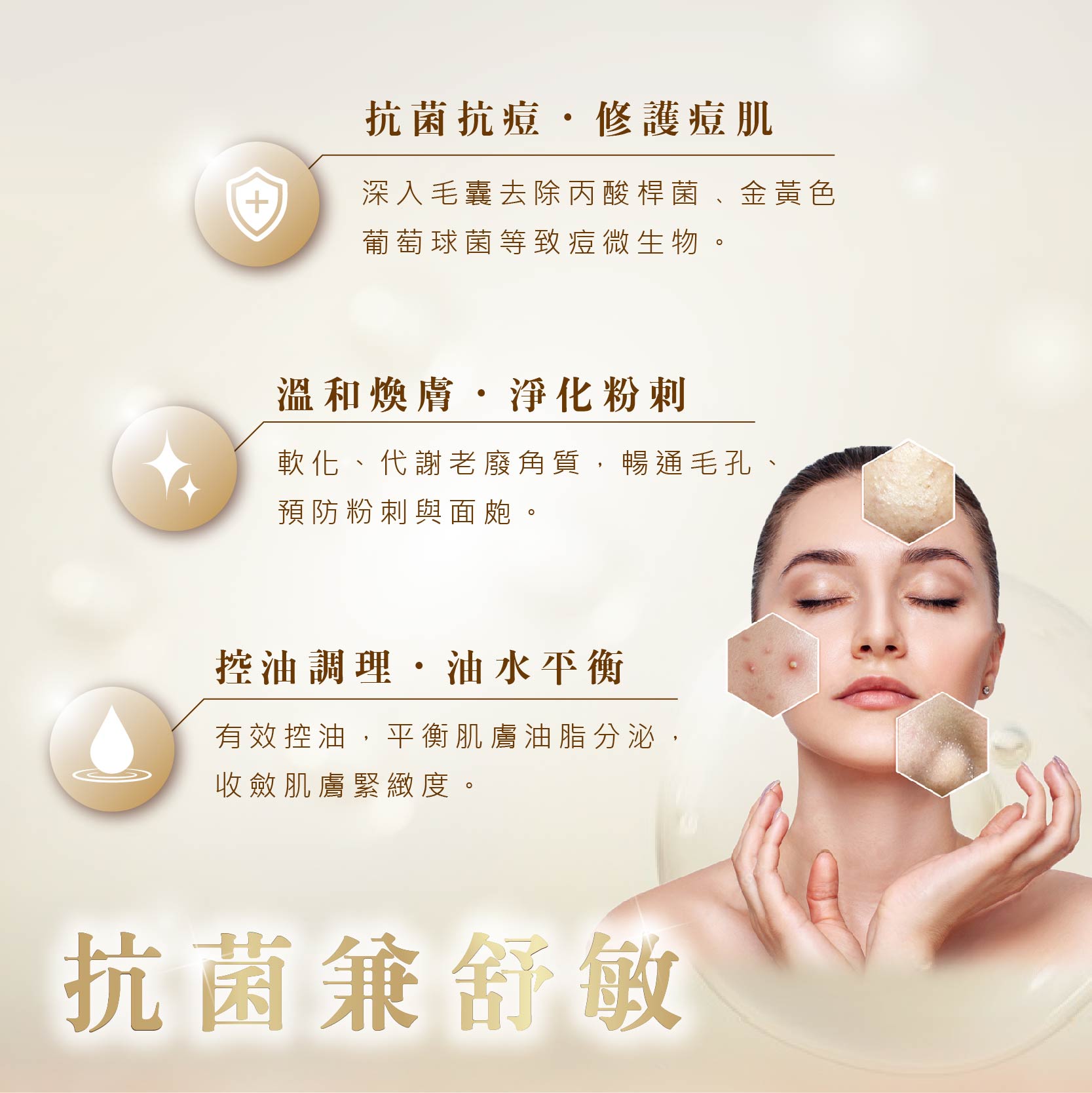 打造肌膚好菌生態,消滅丙酸桿菌、葡萄球菌等致痘病菌,深入平衡肌膚分泌並立即收斂毛孔,重啟肌膚循環機制,達成實證煥膚淨透細緻。